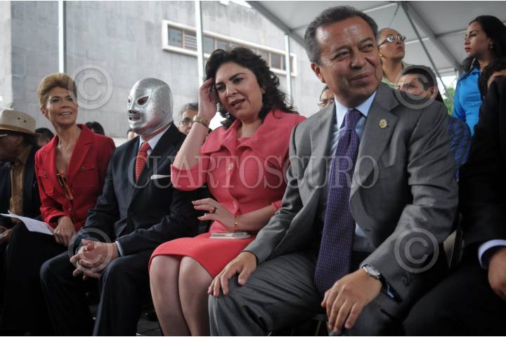 MEXICO, D.F., 22JULIO2015.- Jorge Guzmán "El Hijo del Santo", Ivonne Ortega Pacheco, secretaria general del PRI y Cesar Camacho Quiroz, presidente del PRI nacional, durante la inauguración del Corredor Cultural Ídolos del Ring en la barda perimetral de la sede nacional del partido. FOTO: DIEGO SIMÓN SÁNCHEZ /CUARTOSCURO.COM