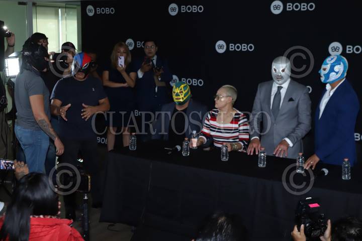 CIUDAD DE MÉXICO, 28AGOSTO2024. Cerebro Negro, Lady Apache, El Hijo del Santo y Ciclón Ramírez durante la conferencia de prensa para anunciar los pormenores de la gira de despedida con el nombre “Todo x el todo” en la que el Hijo del Santo cerraría su ciclo después de 43 años de carrera. FOTO: EDGAR NEGRETE LIRA/CUARTOSCURO.COM