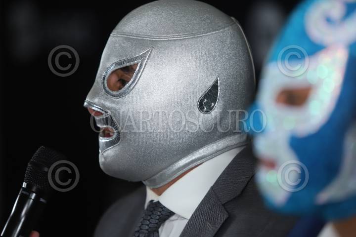 CIUDAD DE MÉXICO, 28AGOSTO2024. El luchador enmascarado Ciclón Ramírez a un costado de el Hijo del Santo durante la conferencia de prensa para anunciar los pormenores de la gira de despedida con el nombre “Todo x el todo”, en la que el Hijo del Santo cerraría su ciclo después de 43 años de carrera. FOTO: EDGAR NEGRETE LIRA/CUARTOSCURO.COM