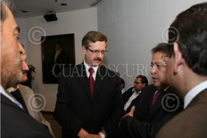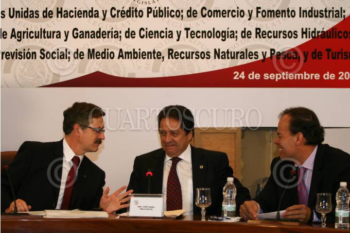 MÉXICO D.F., 24SEPTMEBRE2008.-Juan Carlos Romero Hiks, titular de CONACYT, acudió está tarde a las instalaciones del Senado de la República, donde compareció ante las comisiones unidas del Senado de la República. En la imagen, dialoga con el senador José Isabel Reyes. FOTO: GUILLERMO PEREA/CUARTOSCURO.COM