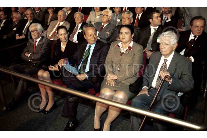 Acompañan a Jesús Silva durante la presentación de su proyecto "Una ciudad en Orden": el escritor Alí Chumacero (atrás), Hildegard de Silva Herzog, Dulce María Sauri, presidenta nacional del PRI. FOTO: Germán Hernández/CUARTOSCURO.COM