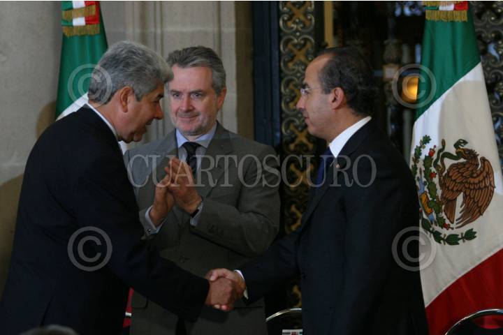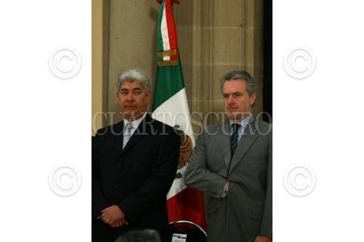 MÉXICO, D.F. 19SEPTIEMBRE2007.- El secretario de gobernación, Francisco Ramírez Acuña y Santiago Creel Miranda, coordinador parlamentario del PAN en la Cámara de Senadores durante la celebración del día de protección civil en Palacio Nacional. FOTO: PAOLA HIDALGO/CUARTOSCURO.COM