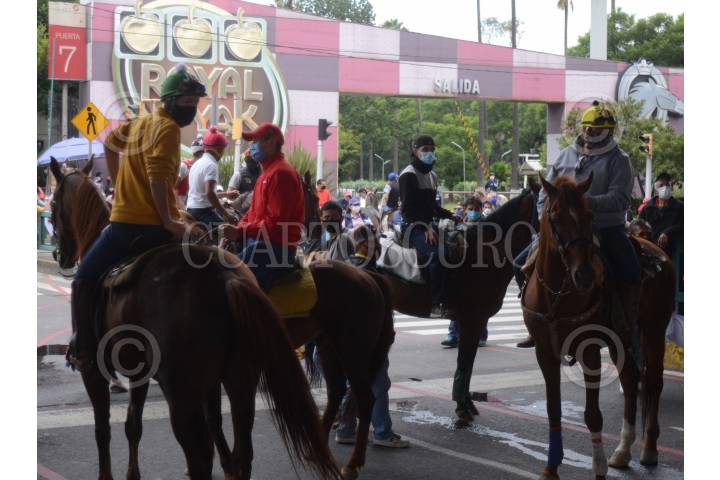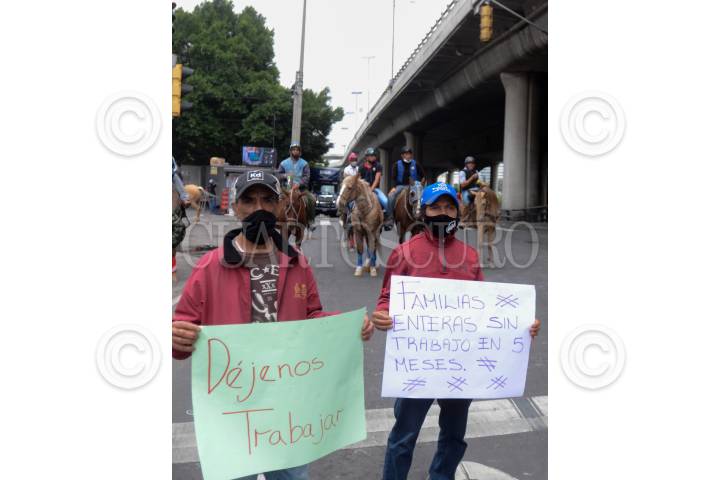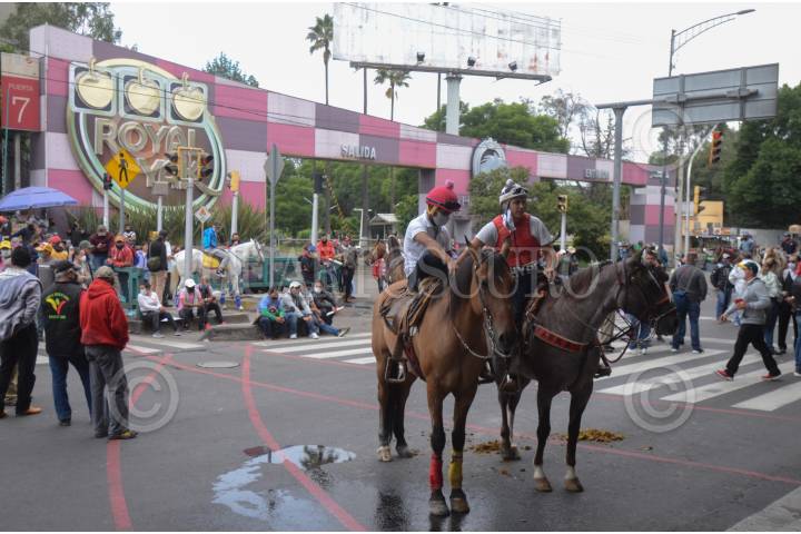 Bloqueo de jinetes sobre hipódromo de las américas en la lateral de Periférico e Ingenieros Militares como protesta para solicitar la reapertura del inmueble, ya que su economía se ha visto afectada por la pandemia de covid-19.