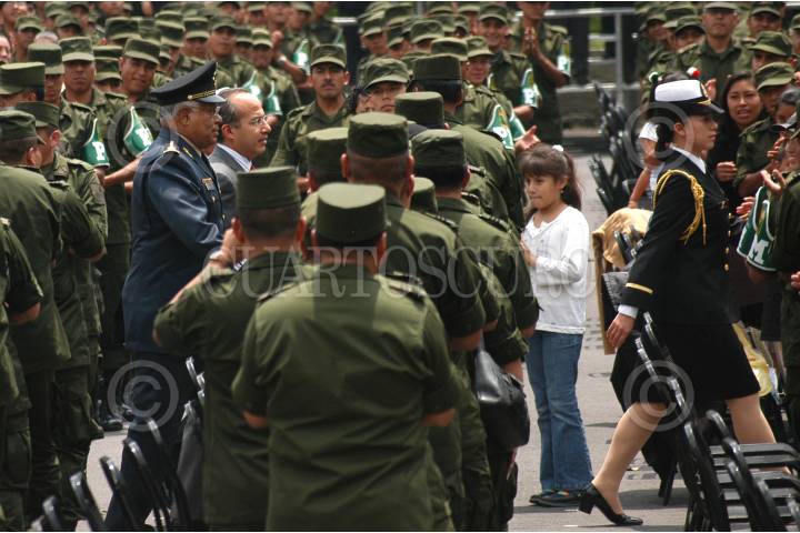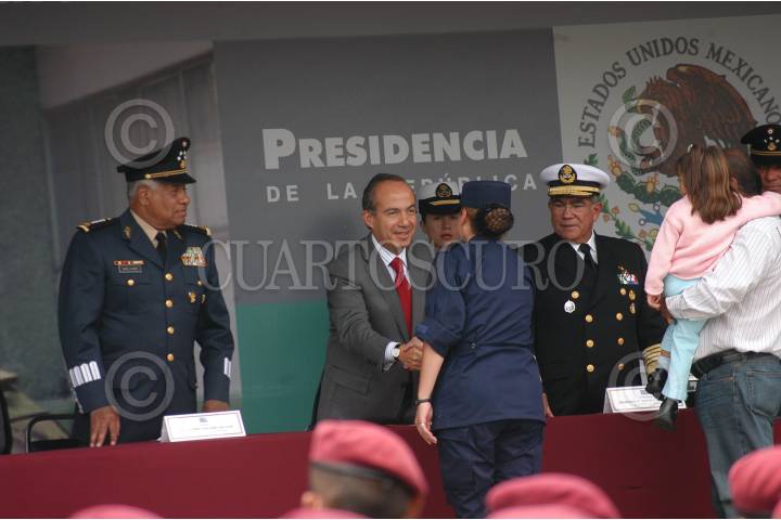 MÉXICO D.F. 23JULIO2007.-El presidente Felipe Calderón Hinojosa, acompañado de Guillermo Galvan Galvan Secretarío de de la Defensa Nacional y de Francisco Syanez Mendoza Secretarío de Marina, durante la ceremonia de la Entrega de Creditos Hipotecarios para la fuerzas armadas que se realizó en el Campo Militar No. 1A.En la imagen El presidente, saluda de mano a una soldado a la cual le fue entregado el credito de manos del presidente FOTO: GUILLERMO PEREA/CUARTOSCURO.COM