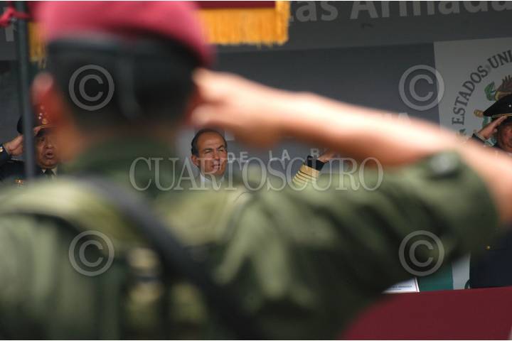 MÉXICO D.F. 23JULIO2007.-El presidente Felipe Calderón Hinojosa, acompañado de Agustin Cartens Secretarío de Hacianda y Credito Público, Guillermo Galvan Galvan Secretarío de la Defensa Nacional y de Francisco Syanez Mendoza Secretarío de Marina, durante la ceremonia de la Entrega de Creditos Hipotecarios para la fuerzas armadas que se realizó en el Campo Militar No. 1A. FOTO: GUILLERMO PEREA/CUARTOSCURO.COM