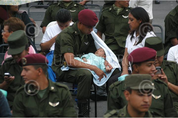 MÉXICO D.F. 23JULIO2007.-Durante la ceremonia de la Entrega de Creditos Hipotecarios para la fuerzas armadas que se realizó en el Campo Militar No. 1A.En la imagen un soldado carga a su hijo en sus brazos. FOTO: GUILLERMO PEREA/CUARTOSCURO.COM
