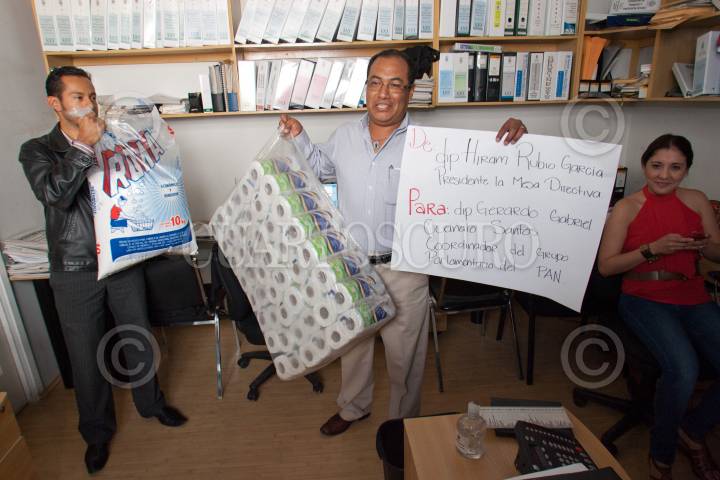 QUERETARO, QUERETARO, 22JULIO2011.- El diputado Hiram Rubio, presidente de la mesa directiva, envió 10 kilogramos de jabón Roma y un paquete de papel higiénico a su homólogo del PAN Gerardo Cuanalo, quién le criticó al priista hacer gastos suntuarios y no en las necesidades del congreso como papel higiénico. FOTO: DEMIÁN CHÁVEZ/CUARTOSCURO.COM