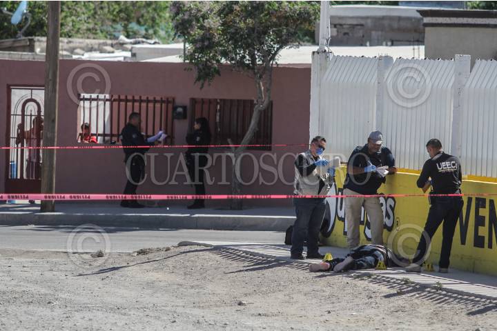 CIUDAD JUÁREZ, CHIHUAHUA, 02MAYO2025.- Esta mañana en Ciudad Juárez, un hombre de aproximadamente 30 años fue asesinado de seis balazos cuando llegaba a su lugar de trabajo, una empresa de pisos y azulejos ubicada en el cruce de Paseo de la Victoria y Camino Viejo a la Rosita. La víctima, quien se desempeñaba como montacarguista, fue atacada mientras descendía de un vehículo azul con placas de Texas. El agresor huyó a pie por un terreno baldío y no ha sido detenido. FOTO: CARLOS SÁNCHEZ COLUNGA/CUARTOSCURO.COM