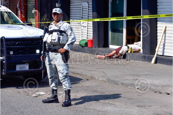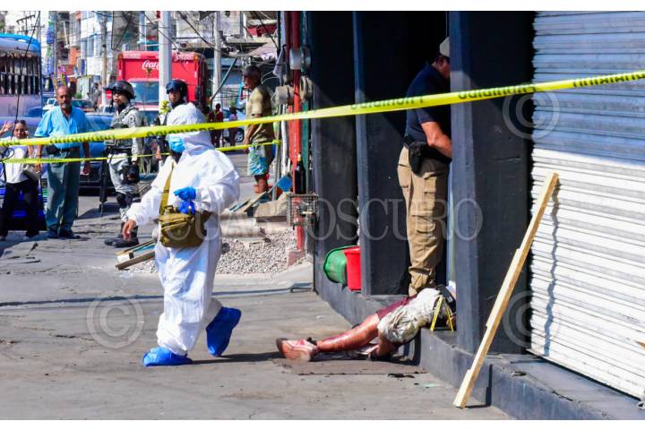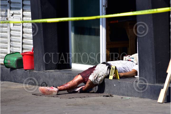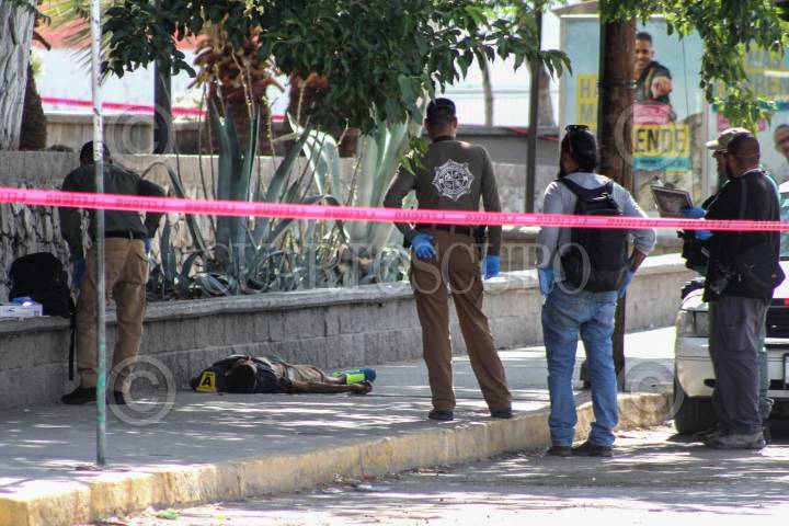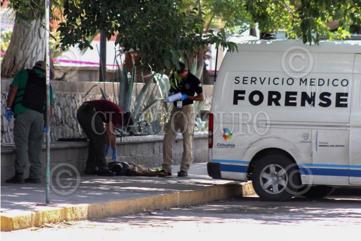 CIUDAD JUÁREZ, CHIHUAHUA, 23JULIO2019.- Un hombre fue privado de la vida cuando caminaba un costado de la Presidencia Municipal de Ciudad Juárez, esto sucedió enfrente de varios testigos que pasaban por el lugar cuando dos hombres le dispararon a quema ropa. El hombre de aproximadamente de 26 años recibió diversos balazos en la cabeza y el pecho, quedó tirado sobre la banqueta. Los hechos violentos fueron en los cruces avenida David Herrera Jordán y la avenida Francisco Villa quedaron cerradas a la circulación. Con este hecho suman ya 100 homicidios del mes de Julio. FOTO: NACHO RUÍZ /CUARTOSCURO.COM