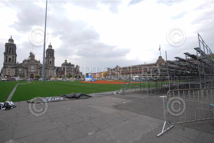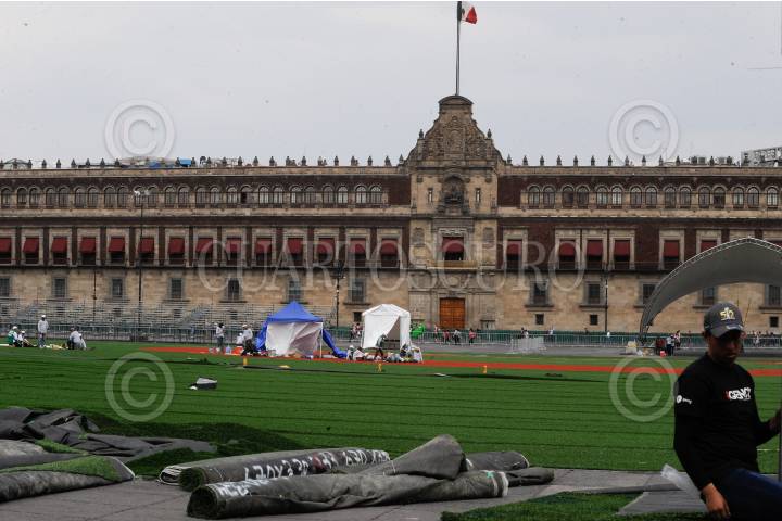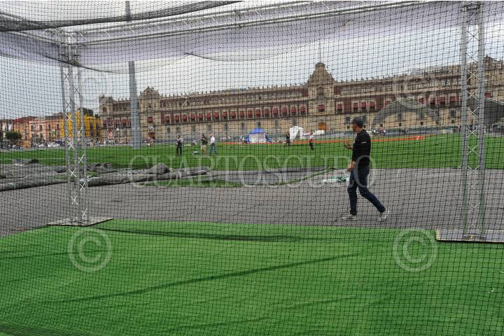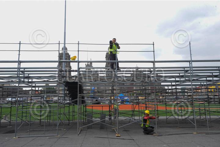 CIUDAD DE MÉXICO, 23MARZO2016.- Trabajadores de la CDMX continúan en el zócalo la construcción del campo de béisbol que se utilizará para el Home Run Derby, el viernes se prevé una clínica para dos mil niños de las diferentes ligas infantiles de béisbol. Sábado y domingo estarán jugadores de Padres de San Diego y Astros de Houston, quienes disputarán un encuentro en pleno corazón de la capital. FOTO: ARMANDO MONROY /CUARTOSCURO.COM