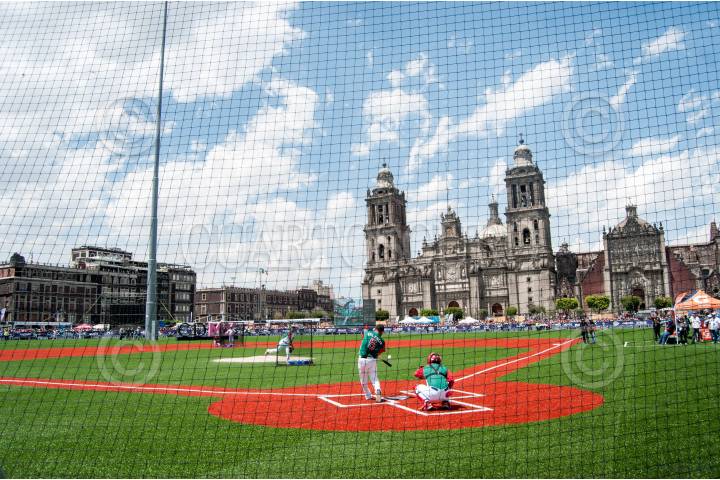 MÉXICO, 14JUNIO2015.- Miguel Ángel Mancera realizó el lanzamiento inaugural Home Run Derby en el Zócalo Capitalino donde miles de personas pudieron apreciar a bateadores de la Liga Mexicana de Béisbol lanzando sus mejores golpes durante casi dos horas en la cancha que fue habilitada en la plancha. FOTO: ENRIQUE ORDÓÑEZ /CUARTOSCURO.COM