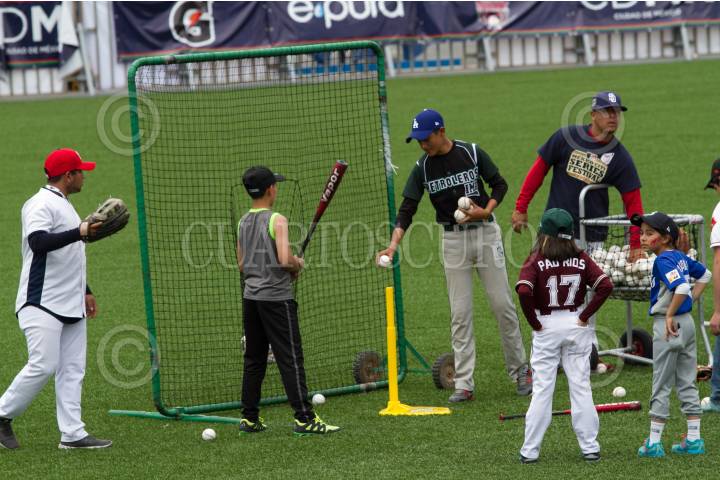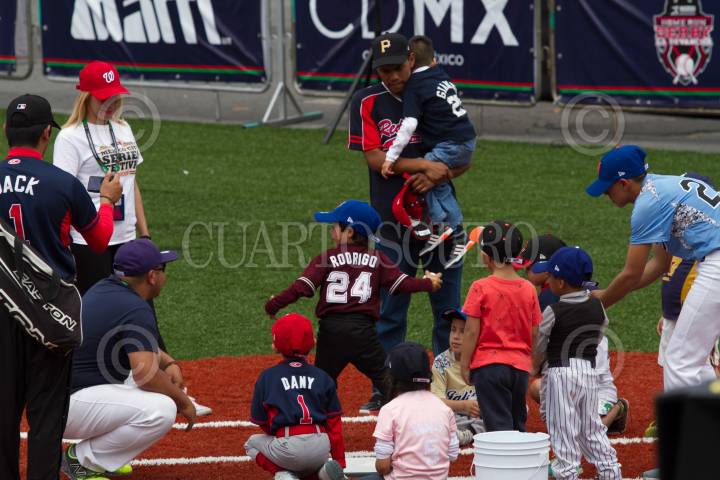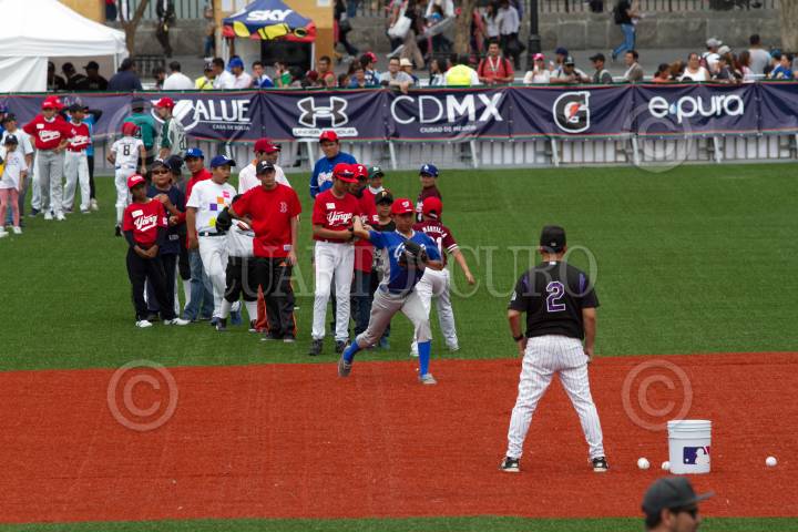 CIUDAD DE MÉXICO, 27MARZO2016.- Niños, algunos que apenas están aprendiendo a caminar, aprenden los secretos de la pelota caliente de instructores profesionales en el "Home Run Derby", incluso con estrellas ligamayorista como Ismael "el Rocket" Valdez, que les dió las claves para subirse a la loma en el diamante instalado ex profeso en el Zócalo capitalino. FOTO: MOISÉS PABLO /CUARTOSCURO.COM