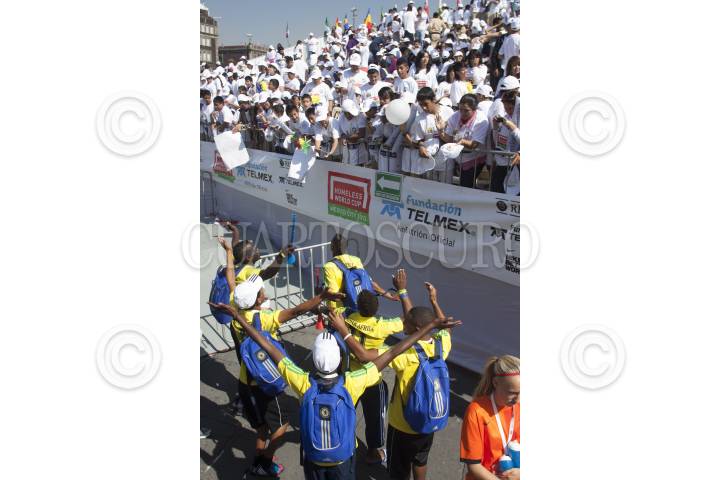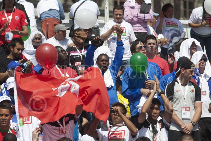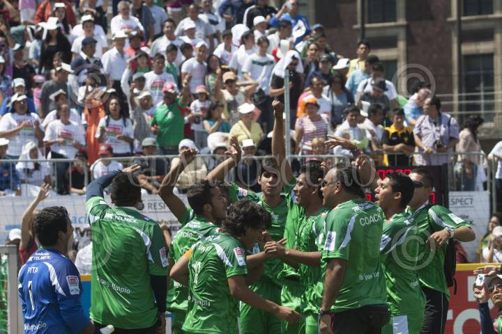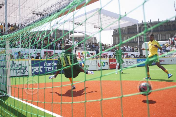 MÉXICO, D.F., 06OCTUBRE2012.- La Selección Mexicana venció a la escuadra Sudafricana en el partido inaugural del Homeless World Cup México City 2012, que se jugó en el Zocalo. En este torneo participan más de 52 países que juegan unas "cascaritas" de fútbol, los integrantes de estos equipos muchas veces son jóvenes que no tienen donde dormir o están metidos en problemas de drogas o alcohol. La Homeless surgió en 2003 en Europa; uno de sus fundadores fue el escocés Mel Young, con el objetivo de mejorar la calidad de vida de los jóvenes amantes del esférico. FOTO: MOISÉS PABLO /CUARTOSCURO.COM