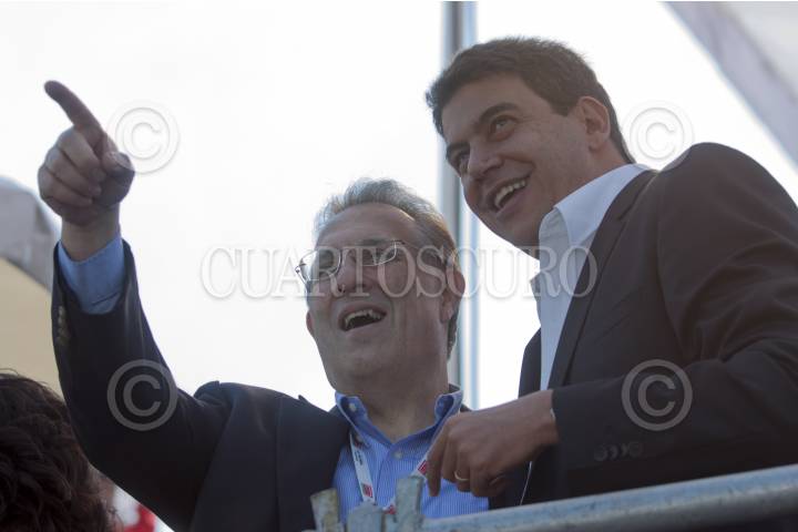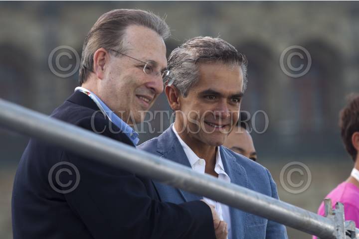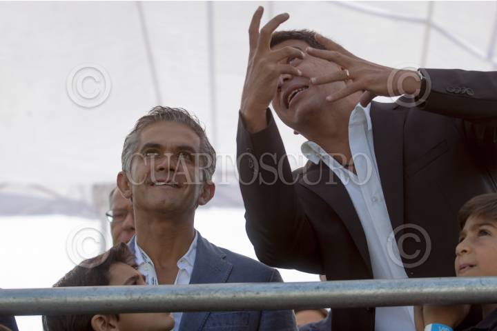 MÉXICO, D.F., 06OCTUBRE2012.- Miguel Ángel Mancera, Jefe de Gobierno Electo, acompañado de sus hijos Miguel y Leonardo, Arturo Elías, presidente de Fundación Telmex, acompañado de su esposa Johanna Slim Domit, y María Teresa Toca, viuda de Alonso Lujambio, presenciaron el juego inaugural del Homeless World Cup México City 2012, mismo que disputaron la Selección Mexicana y la escuadra de Sudáfrica, los locales se impusieron y el torneo esta compuesto por más de 52 países y se jugará en el Zócalo. FOTO: MOISÉS PABLO /CUARTOSCURO.COM