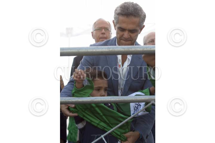 MÉXICO, D.F., 06OCTUBRE2012.- El Jefe de Gobierno Electoral Miguel Ángel Mancera le coloca una playera de la Selección Mexicana de Fútbol. El ex-procurador capitalino acudió en compañia de sus dos hijos a al partido inaugural de la Homeless World Cup México City 2012. este es un torneo en donde 52 países se juegan unas "cascaritas" de fútbol y cuyos integrantes muchas veces son jóvenes que no tienen donde dormir o están metidos en problemas de drogas o alcohol. La Homeless surgió en 2003 en Europa; uno de sus fundadores fue el escocés Mel Young, con el objetivo de mejorar la calidad de vida de los jóvenes amantes del esférico. FOTO: MOISÉS PABLO /CUARTOSCURO.COM