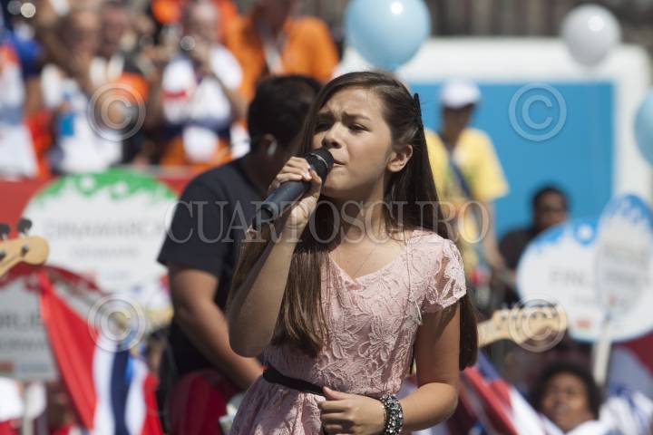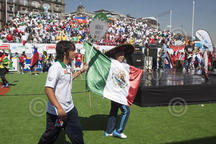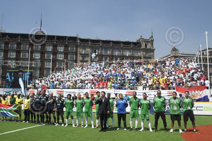 MÉXICO, D.F., 06OCTUBRE2012.- La Selección Mexicana venció a la escuadra Sudafricana en el partido inaugural del Homeless World Cup México City 2012, que se jugó en el Zocalo. En este torneo participan más de 52 países que juegan unas "cascaritas" de fútbol, los integrantes de estos equipos muchas veces son jóvenes que no tienen donde dormir o están metidos en problemas de drogas o alcohol. La Homeless surgió en 2003 en Europa; uno de sus fundadores fue el escocés Mel Young, con el objetivo de mejorar la calidad de vida de los jóvenes amantes del esférico. El cantante Mijares interpreto el Himno Nacional. FOTO: MOISÉS PABLO /CUARTOSCURO.COM