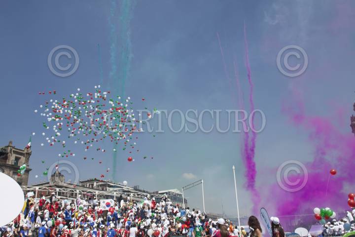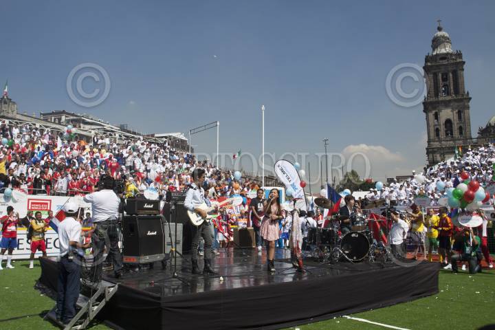 MÉXICO, D.F., 06OCTUBRE2012.- Los Vázquez Sounds amenizaron la inauguración de la Homeless World Cup México City 2012 en el Zócalo. Este es un torneo en donde participan 52 países y los integrantes de estas escuadras muchas veces no tienen casa o están metidos en problemas de drogas y alcohol, por lo que esta iniciativa les una salida que la del deporte en la práctica de fútbol. La Homeless surgió en 2003 en Europa; uno de sus fundadores fue el escocés Mel Young, con el objetivo de mejorar la calidad de vida de los jóvenes amantes del esférico. FOTO: MOISÉS PABLO /CUARTOSCURO.COM