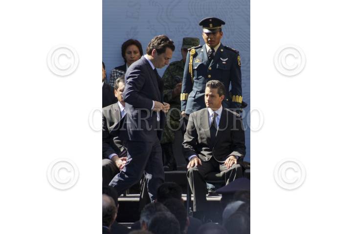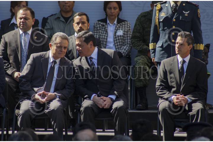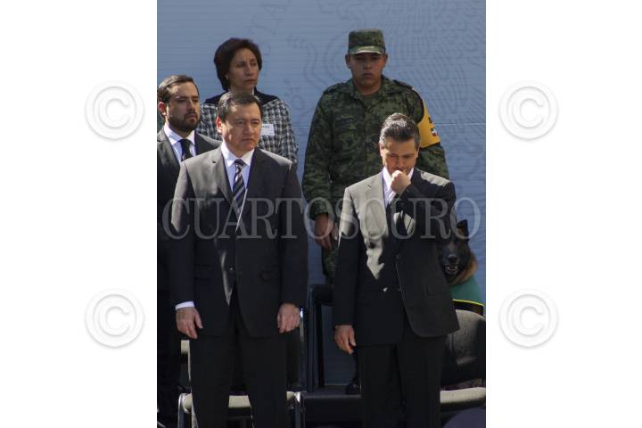 MÉXICO, D.F., 08FEBRERO2013.- Miguel Ángel Osorio Chong; secretario de Gobernación; Enrique Peña Nieto, Presidente de México; durante la ceremonia de homenaje a las 37 victimas de muerte en la explosión en la sede de Petróleos Mexicanos. Además, entregó reconocimientos a las diferentes dependencias y organizaciones ciudadanas que ayudaron el día del siniestro a las victimas. FOTO: ADOLFO VALTIERRA /CUARTOSCURO.COM