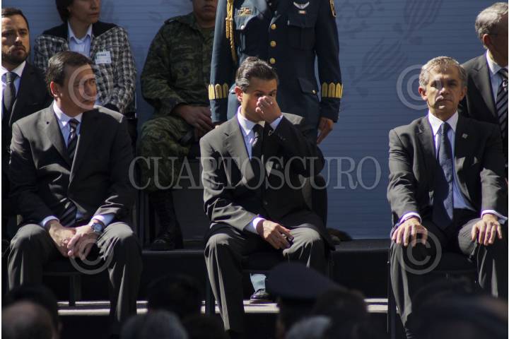 MÉXICO, D.F., 08FEBRERO2013.- Pedro Joaquín Coldwel, secretario de Energía; Miguel Ángel Osorio Chong; secretario de Gobernación; y Enrique Peña Nieto, Presidente de México; durante la ceremonia de homenaje a las 37 victimas de muerte en la explosión en la sede de Petróleos Mexicanos. Además, entregó reconocimientos a las diferentes dependencias y organizaciones ciudadanas que ayudaron el día del siniestro a las victimas. FOTO: ADOLFO VALTIERRA /CUARTOSCURO.COM