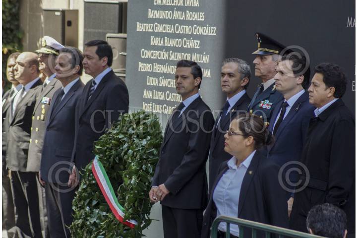 MÉXICO, D.F., 08FEBRERO2013.- Miguel Ángel Mancera, jefe de Gobierno capitalino; Vidal Francisco Soberón Sanz, Secretario de Marina; Salvador Cienfuegos, Secretario de la Defensa Nacional; y Yoloxóchitl Bustamante Díez, Directora del Instituto Politécnico Nacional; durante la ceremonia de homenaje a las 37 victimas de muerte en la explosión en la sede de Petróleos Mexicanos. Además, entregó reconocimientos a las diferentes dependencias y organizaciones ciudadanas que ayudaron el día del siniestro a las victimas. FOTO: ADOLFO VALTIERRA /CUARTOSCURO.COM