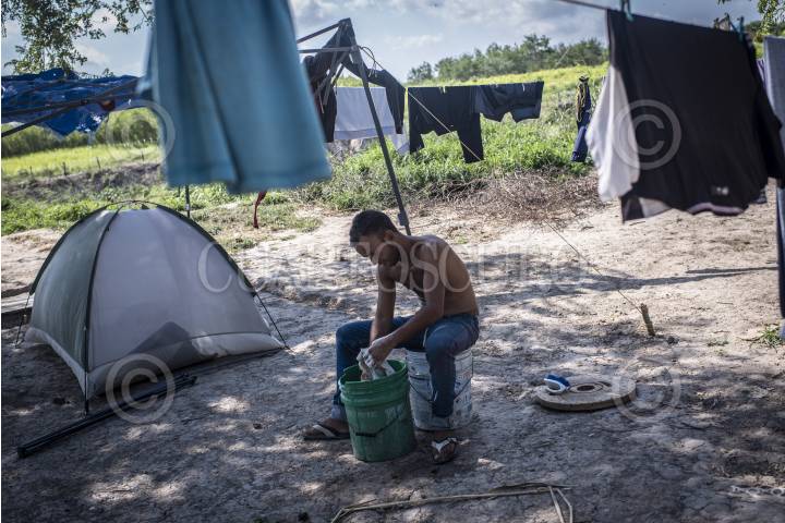 Migrantes, en su mayoría venezolanos, hondureños y salvadoreños, aguardan en un campamento improvisado a las orillas del río bravo, su proceso de cita para solicitud de asilo en Estados Unidos, el cual realizan a través de la aplicación CBP-One. Los tiempos de espera de trámite varían, algunos de los reunidos en la frontera acampan durante meses antes de recibir noticia aprobatoria acerca de su cita, otros a los días o semanas son aceptados, algunos mas deciden cruzar el río burlando a las autoridades estadounidenses o entregándose a ellas pidiendo refugio.