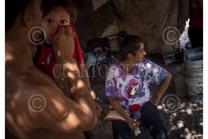 Migrantes venezolanos se abastecen de agua no potable en el campamento a orillas de río bravo. Migrantes, en su mayoría venezolanos, hondureños y salvadoreños, aguardan en un campamento improvisado a las orillas del río bravo, su proceso de cita para solicitud de asilo en Estados Unidos, el cual realizan a través de la aplicación CBP-One. Los tiempos de espera de trámite varían, algunos de los reunidos en la frontera acampan durante meses antes de recibir noticia aprobatoria acerca de su cita, otros a los días o semanas son aceptados, algunos mas deciden cruzar el río burlando a las autoridades estadounidenses o entregándose a ellas pidiendo refugio.