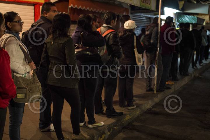 MEXICO, D.F., 11SEPTIEMBRE2014.- Los pasajeros, que en su mayoría provienen de zonas marginadas al sur de la ciudad y Estado de México, han optado por desplazarse como hacían antes de la línea 12, desplazándose primero a Tulyehualco para realizar un trayecto de más de una hora hasta la estación Taxqueña del metro, en combis que brindan servicio directo por $13, más el costo de la entrada al metro. Esto supone un gasto extra de $8 para el de por sí devaluado salario que perciben más de la mitad de los habitantes de esta ciudad. En promedio, para llegar hasta una estación del metro desde el sur de la ciudad hay que transbordar dos o tres veces y cuesta hasta $25, en algunos casos más. En la imagen, la fila de pasajeros que espera para abordar un taxi colectivo al metro Constitución de 1917, de la línea 8. Esta es una de las alternativas empleada por los usuarios para llegar al metro. El costo por persona es de hasta $25. FOTO: DAVID POLO /CUARTOSCURO.COM