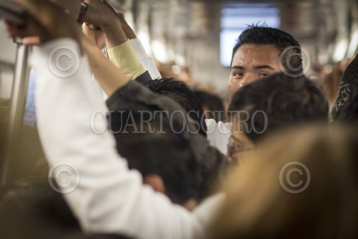 MÉXICO, D.F., 11SEPTIEMBRE2014.- Este 11 de septiembre la Línea 12 del metro de la Ciudad de México cumplirá 6 meses cerrada tras su repentina clausura en el pasado mes de marzo. A pesar de que la gente del sur de la ciudad se ha adaptado a esta situación, los beneficios directos anunciados un día por el gobierno de Ebrard se han convertido en perjuicios para la sociedad, que ha visto su tiempo y dinero menguado en los transportes extras y los trayectos a bordo del transporte emergente que el gobierno capitalino pusiera a disposición del STC Metro, para hacer un recorrido análogo al del metro sobre la accidentada avenida Tláhuac. Los funcionarios encargados del servicio con camiones de RTP afirman que el trayecto de Tláhuac a Atlalilco lleva un tiempo de 50 a 60 minutos, sin embargo, en realidad toma hasta 90 minutos recorrer las 11 estaciones cerradas del metro, un trayecto que en tren se realizaba en 25 minutos; y la gente afirma que desplazarse hasta su destino les toma hasta una hora más de lo acostumbrado. Por otro lado, el transporte público privado que obtuvo permiso para acceder al CETRAM Tláhuac se ha visto afectado con una disminución de su demanda, desplazando una cantidad hasta 40% menor de pasaje. En la imagen, algunos de los pasajeros que logran entrar apretados al vagón duermen de píe. A veces no es necesario sostenerse de los pasamanos para no caer, debido a la cantidad de personas que viajan apretujadas en los vagones. FOTO: DAVID POLO /CUARTOSCURO.COM