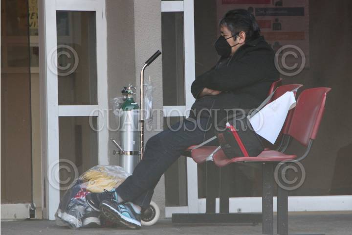 Una mujer espera junto a su tanque de oxígeno el ingreso al Hospital Enrique Cabrera. FOTO: ROGELIO MORALES /CUARTOSCURO.COM