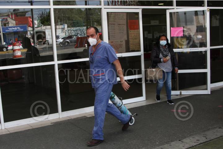 Personal médico apoya con tanque de oxígeno a paciente del Hospital Enrique Cabrera. FOTO: ROGELIO MORALES /CUARTOSCURO.COM