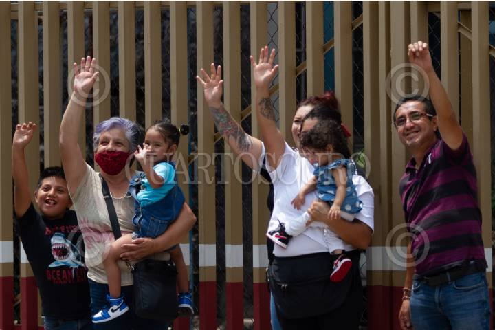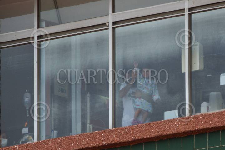 Una familia saluda desde la calle a una niña internada en el Hospital Infantil de México "Federico Gómez"