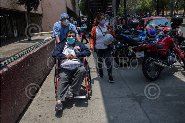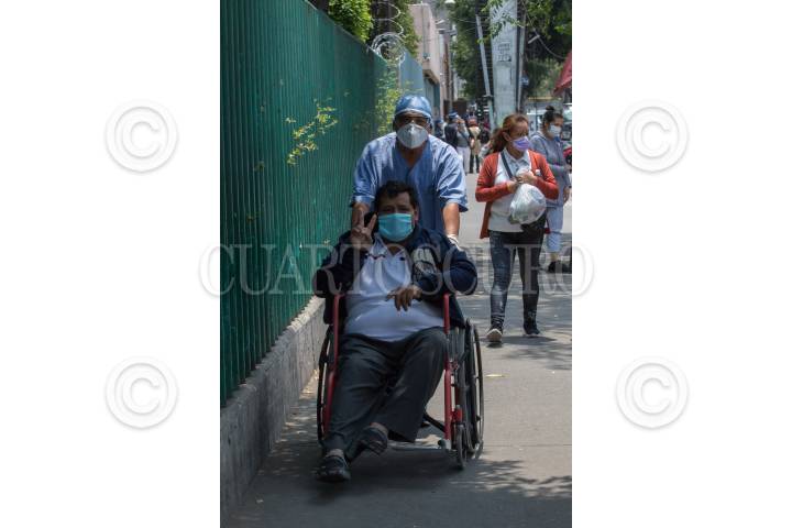 Juan Manuel Pérez sale en silla de ruedas acompañado de su esposa tras superar el Covid-19 en el Hospital de Infectología del IMSS