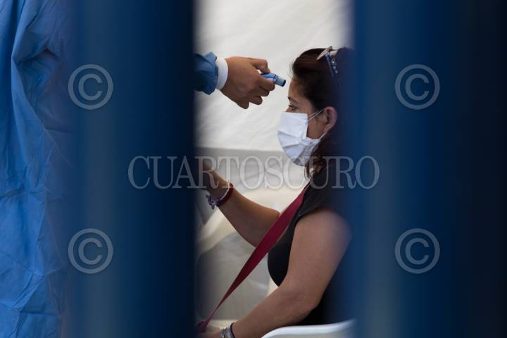 Un médico le toma la temperatura a una mujer en el Hospital Rubén Leñero, el cual ha sido dispuesto para atender a pacientes con Covid-19
