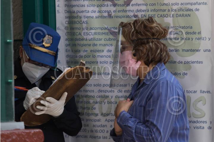 Una mujer da sus datos en la puerta de urgencias del Hospital Rubén Leñero para poder ingresar y recibir noticias de paciente el cual fue diagnosticado con Covid-19