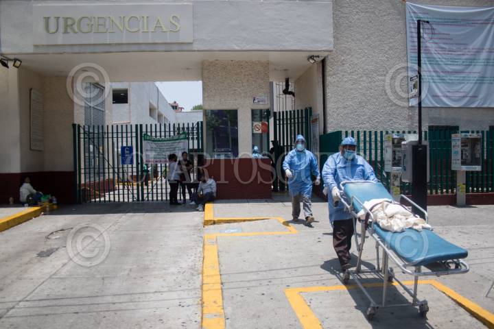 Personal de una funeraria equipado con trajes especiales trasladan a un difunto de Covid-19 en el Hospital Rubén Leñero