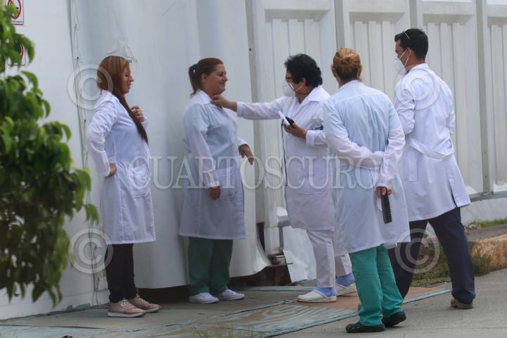 Personal médico conversan en el patio del Hospital de Especialidades Belisario Domínguez