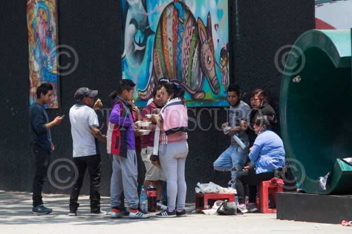 Una familia entera almuerza en las inmediaciones del Hospital de Expansión de Covid-19 en donde esperan noticias de su paciente