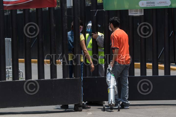 Un hombre entra con un tanque de oxígeno al Hospital de Expansión para pacientes de Covid-19