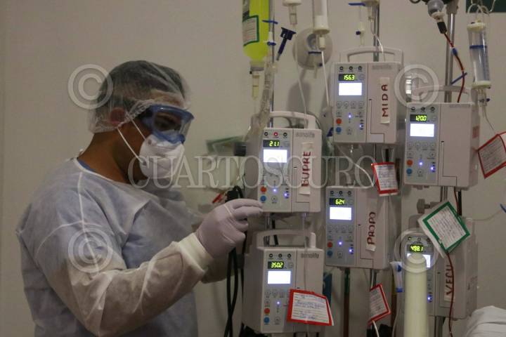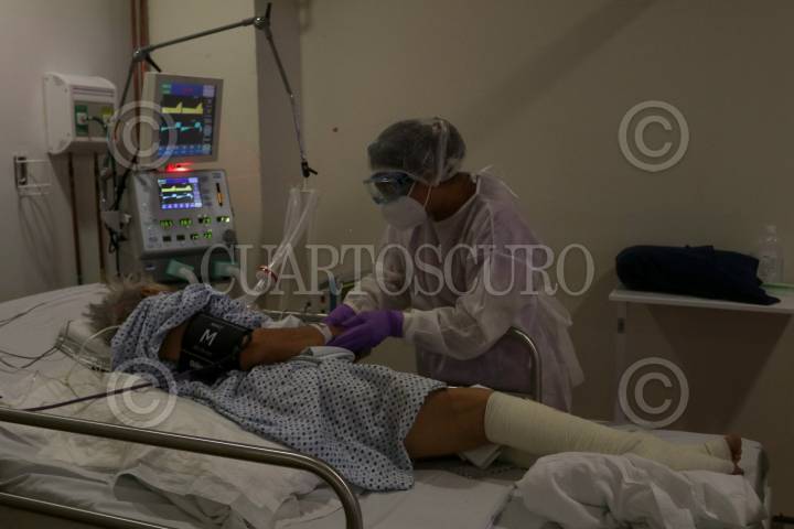 Un médico revisó el estado de salud de un paciente con Covid-19 en el Pabellón de Terapia Intensiva en el Hospital de Expansión Autódromo Hermanos Rodríguez
