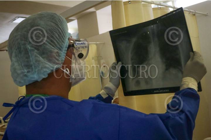 Un médico revisó la radiografía de una paciente con Covid-19 en el Pabellón de Terapia Intermedia en el Hospital de Expansión Autódromo Hermanos Rodríguez