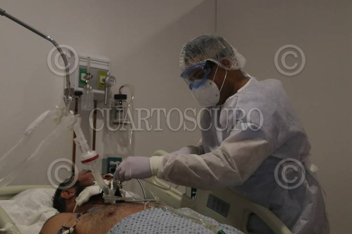 Un médico revisó a un paciente de Covid-19 intubado en el Pabellón de Terapia Intensiva del Hospital de Expansión Autódromo Hermanos Rodríguez