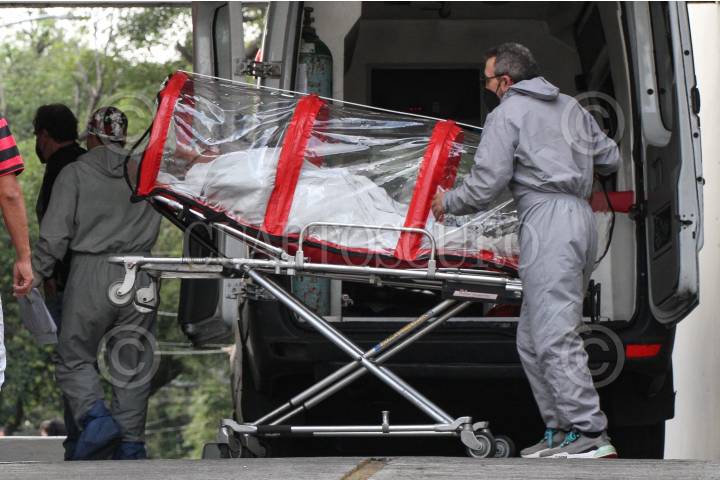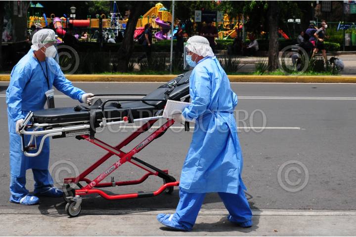 Dos. Médicos trasnportan la camilla donde internaron a un paciente por Covid-19.