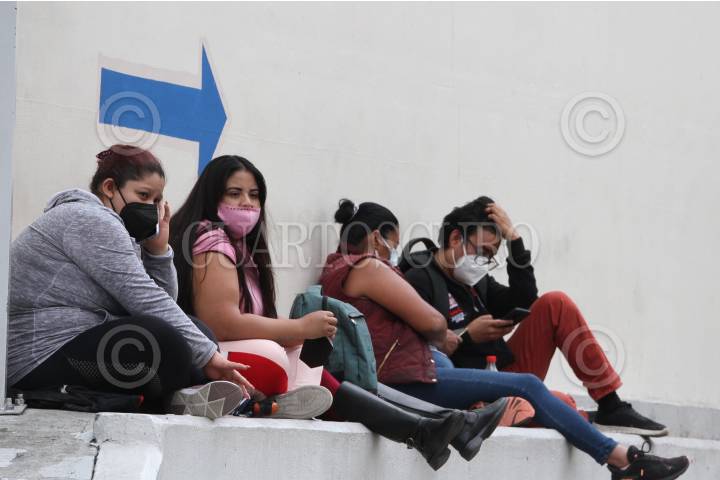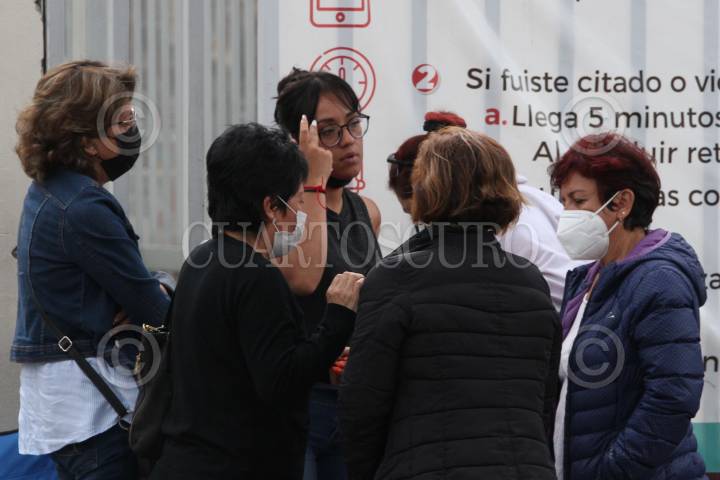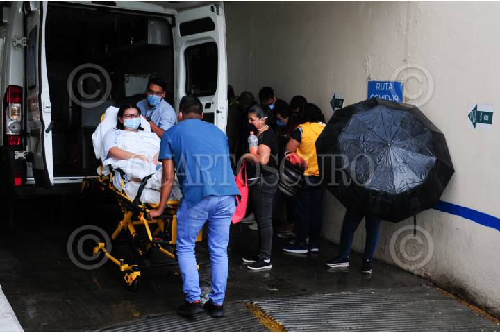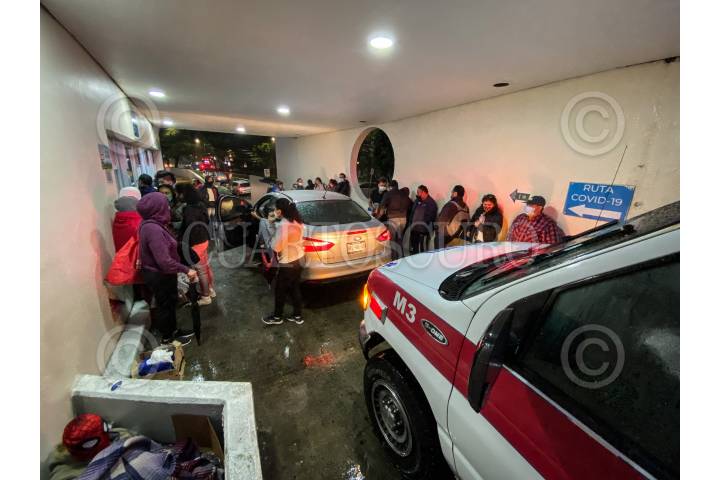 Debido a las fuertes lluvias familiares de personas con pacientes internados por coronavirus, se aglomeran en la entrada del área de urgencias del Hospital de los Venados, esto sin importar la llegada de más pacientes confirmados por COVID-19.