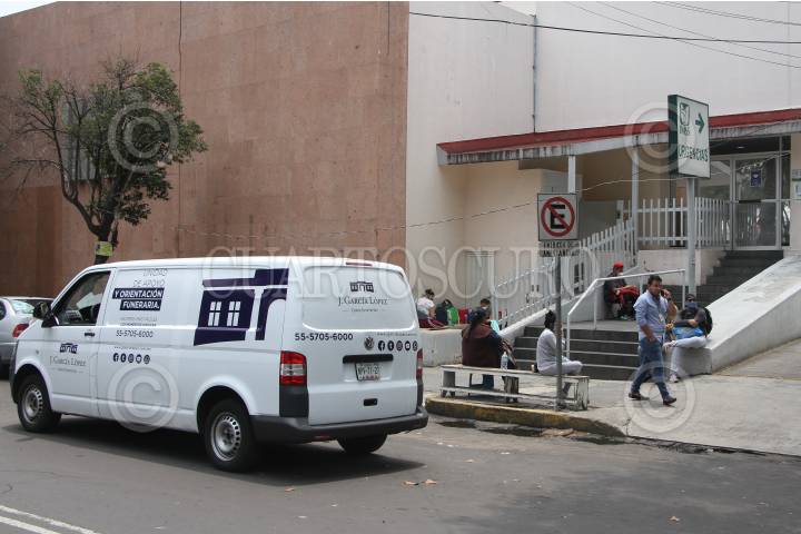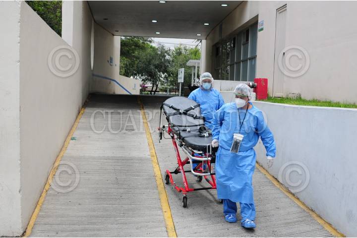 Médicos sacan de la zona triage del Hospital de los Venados una camilla donde trasladaron un enfermo por Covid-19.