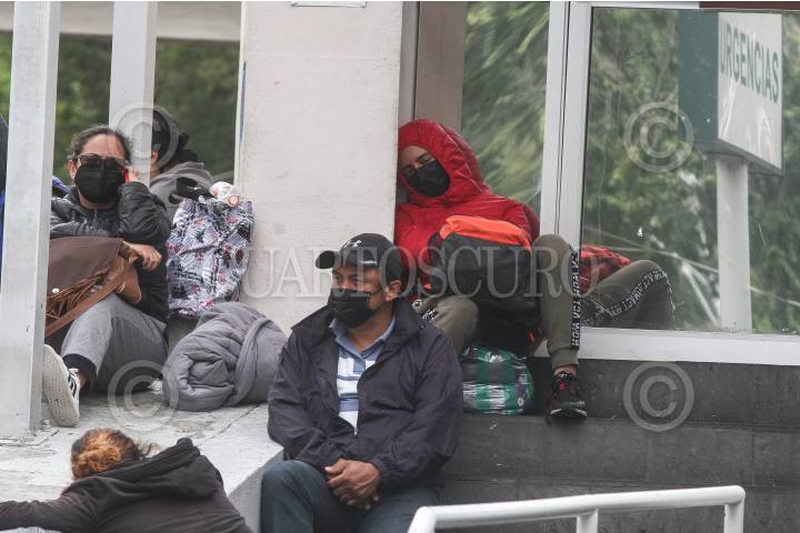 Debido a las fuertes lluvias familiares de personas con pacientes internados por coronavirus, se aglomeran en la entrada del área de urgencias del Hospital de los Venados, esto sin importar la llegada de más pacientes confirmados por COVID-19.