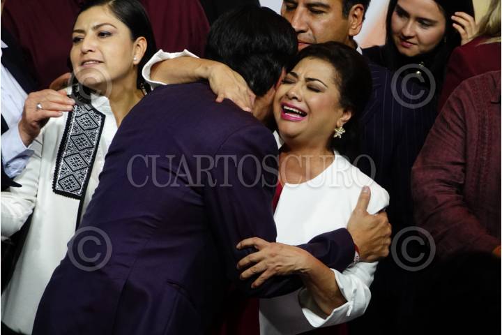 CIUDAD DE MÉXICO, 11NOVIEMBRE2023.- Mario Delgado, dirigente Nacional de MORENA, abraza a Clara Brugada, electa como la coordinadora para la defensa de la Cuarta Transformación en la capital, durante el anuncio de las y los coordinadores estatales ganadores para los estados de Yucatán, Veracruz, Tabasco, Puebla, Guanajuato, Jalisco, Morelia, Chiapas y Ciudad de México en el Hotel Camino Real en Polanco. FOTO: ROGELIO MORALES /CUARTOSCURO.COM
