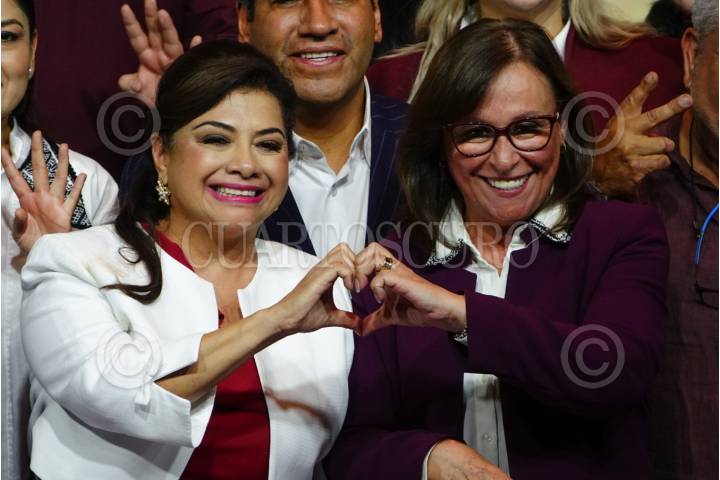 CIUDAD DE MÉXICO, 11NOVIEMBRE2023.- Clara Brugada y Rocío Nahle, electas cómo coordinadoras para la defensa de la Cuarta Transformación en la CDMX y Veracruz, respectivamente, posan tras el anuncio de las y los coordinadores estatales ganadores para los estados de Yucatán, Veracruz, Tabasco, Puebla, Guanajuato, Jalisco, Morelia, Chiapas y Ciudad de México fueron presentados por la comisión de elecciones encabezada por Mario Delgado, dirigente de Morena, esto en el Hotel Camino Real en Polanco. FOTO: ROGELIO MORALES /CUARTOSCURO.COM