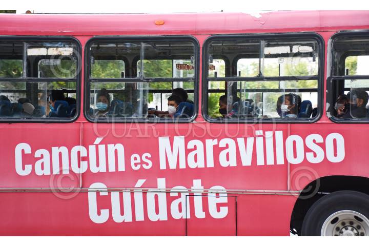 Un autobús de Cancún transita por las calles de ese centro turístico.