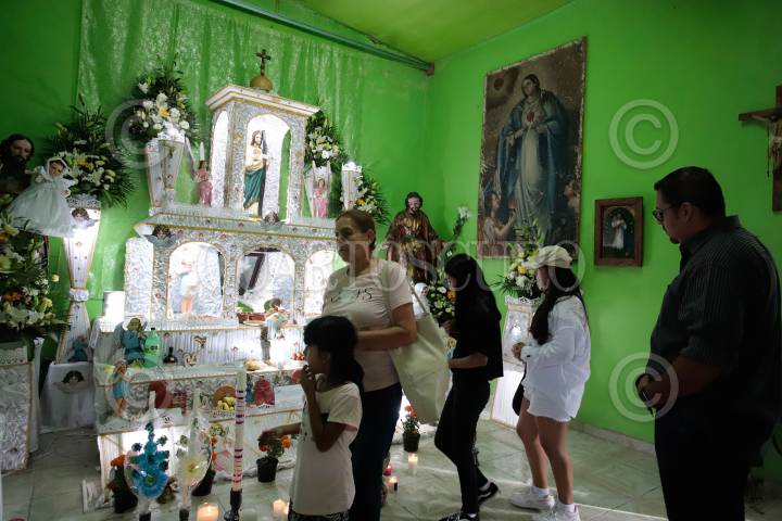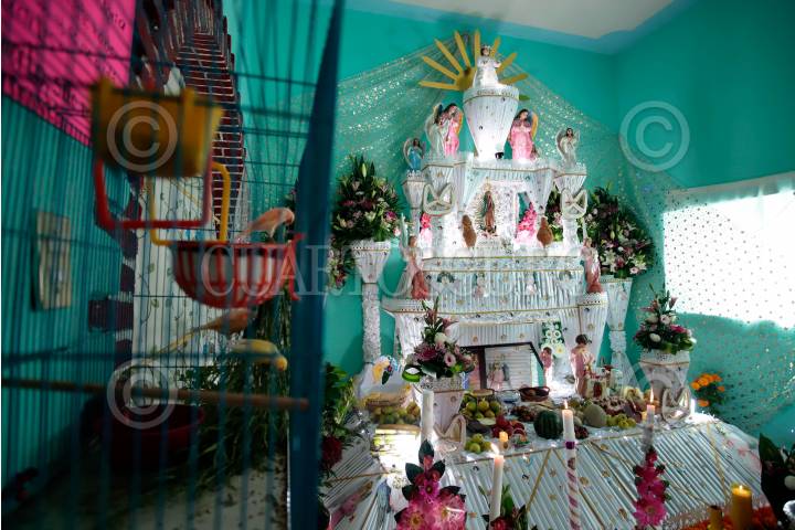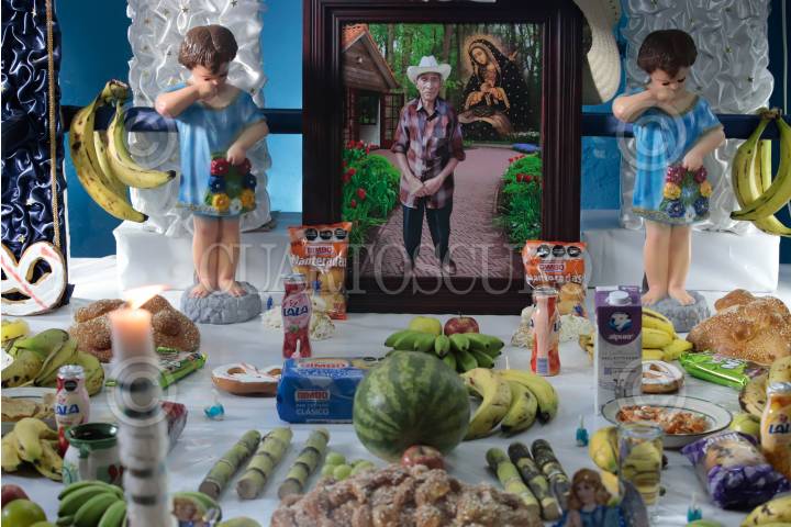 PUEBLA, PUEBLA, 01NOVIEMBRE2024.- Familias del municipio de Huaquechula colocaron los tradicionales altares monumentales que son visitados por decenas de personas. Las ofrendas constan de tres niveles: el primero representa el plano terrenal, en el segundo van los llorones, figuras de barro en forma de niños que representan a los dolientes y en el tercero se representa el cielo. MIREYA NOVO/ CUARTOSCURO.COM