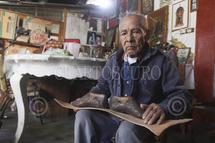 OAXACA, OAXACA, 27AGOSTO2013.- A sus 87 años, Antonio Mendoza, huarachero desde los 11 años, no deja morir esta tradición y aún cuando vive solo, visitado de vez en cuando por alguno de sus cuatro hijos y ya sin ayudantes, él continúa con esta labor, la cual le sirvió para mantener a su familia y darles una educación profesional a sus hijos. Don Toñito, como le conocen en la vecindad en la que habita muestra sus ganas de trabajar, asegura que para el mes de septiembre buscará abrir un taller para que los jóvenes interesados aprendan este antiguo arte y así transmitir sus conocimientos y preservarlos. Don Toñito cumplirá el próximo 3 de septiembre 88 años y afirmó "tengo muchas ganas de trabajar, no se me han quitado". FOTO: ARTURO PÉREZ ALFONSO /CUARTOSCURO.COM